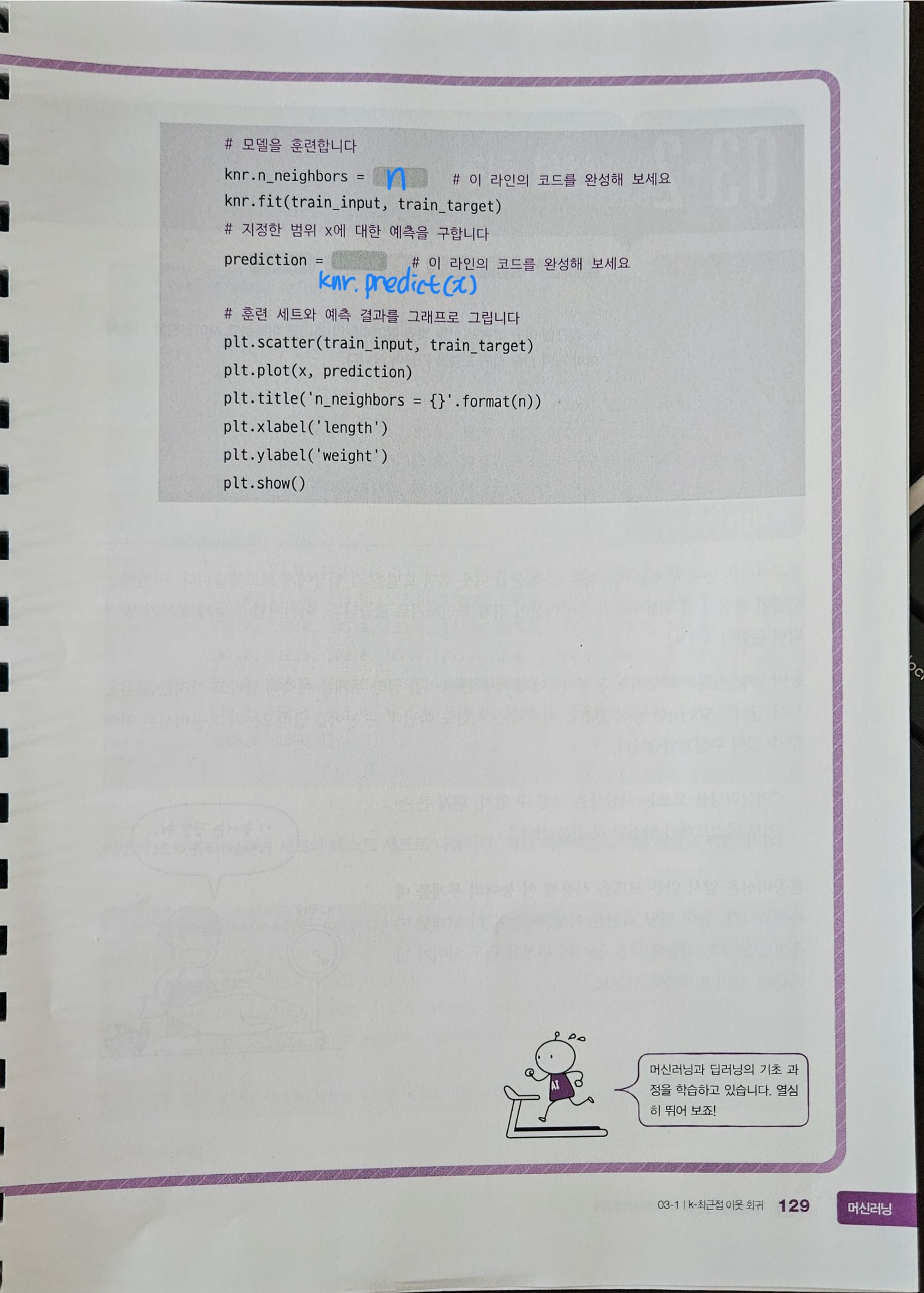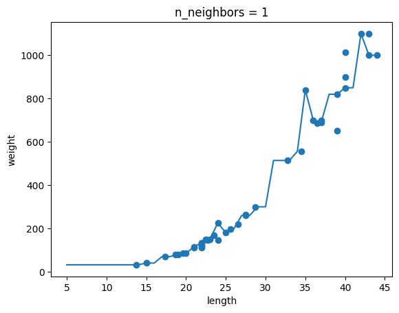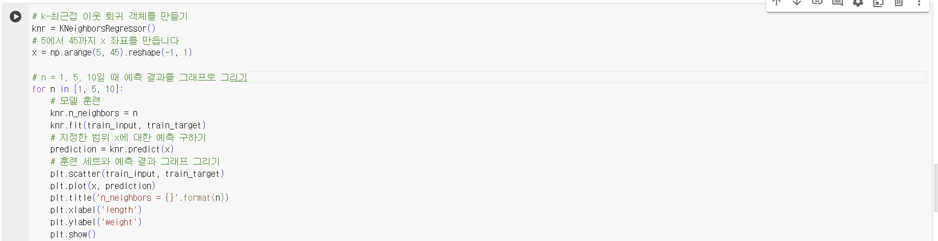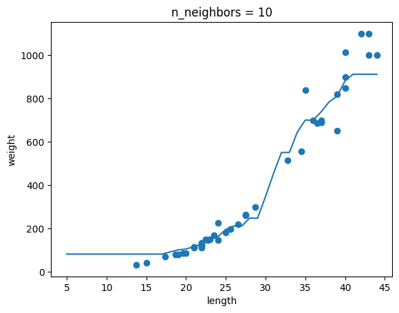 위와 같은 코드를 실행했을 때, n이 커짐에 따라 그래프의 모양이 나타난다. k-최근접 이웃 알고리즘에서 이웃의 개수를 줄이면 훈련세트에 있는 국지적인 패터에 미감해지고, 이웃의 개수를 늘리면 데이터 전반에 있는 일반적인 패턴을 따르기 때문에 n이 1이었을 때, 데이터 값에 좀더 fit한 그래프 모양이 그려지며, 5개, 10개로 늘어날 수록 그래프의 모양이 좀 더 단순하게 나타남을 알 수 있다.